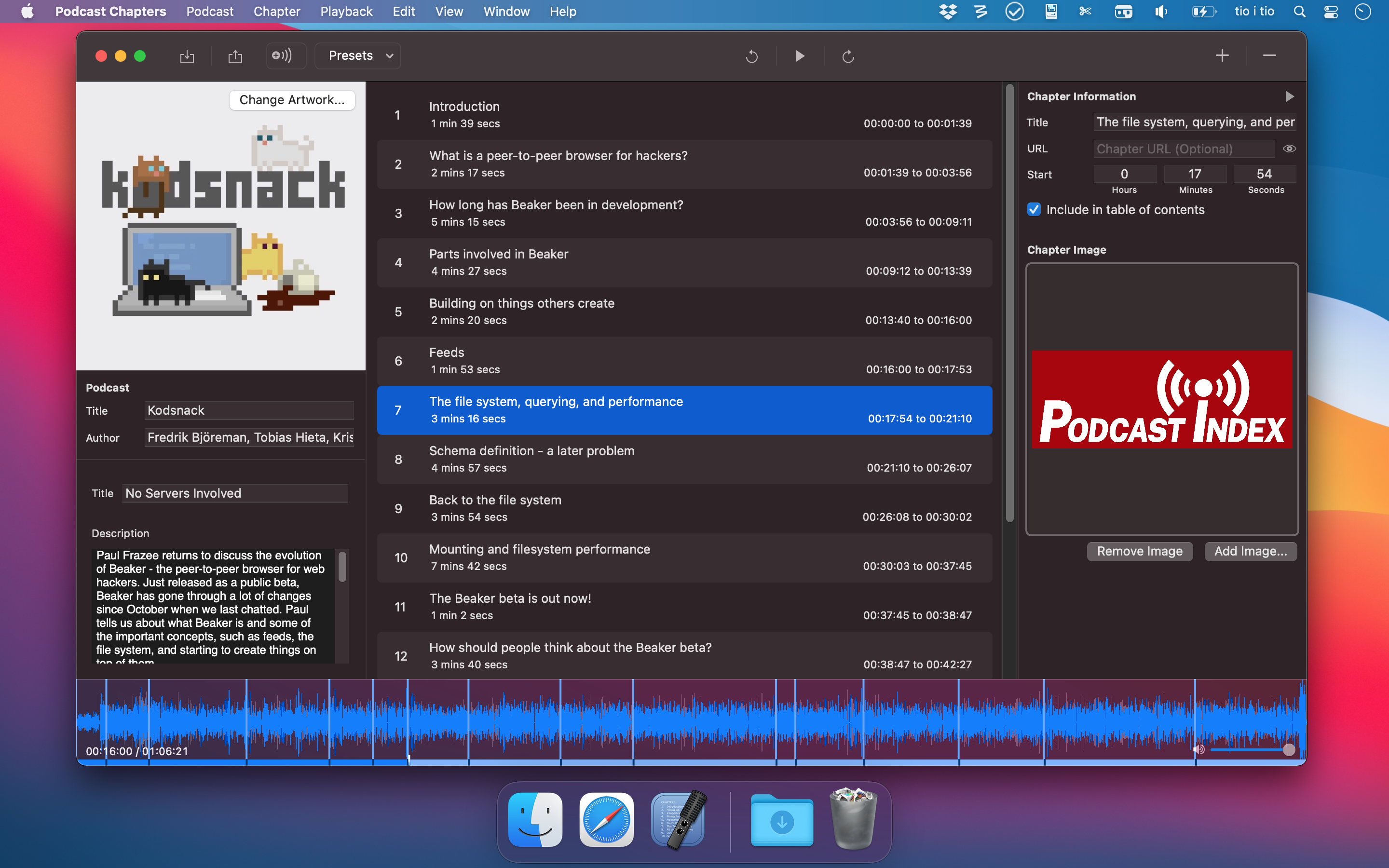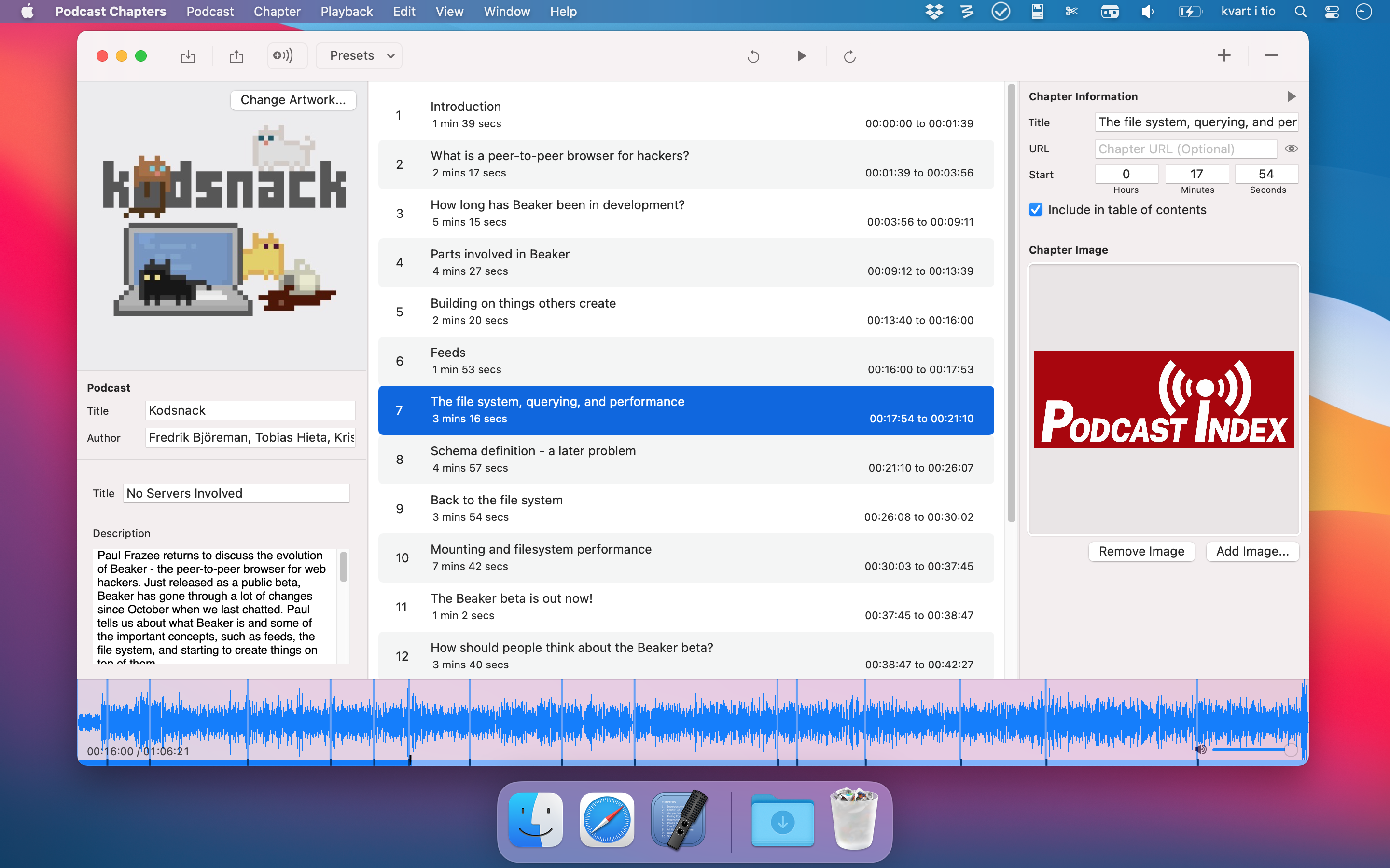 No uploading, using a clunky web interface, and re-downloading. Podcast Chapters is designed for the Mac you use and love, by someone who uses and loves it too.